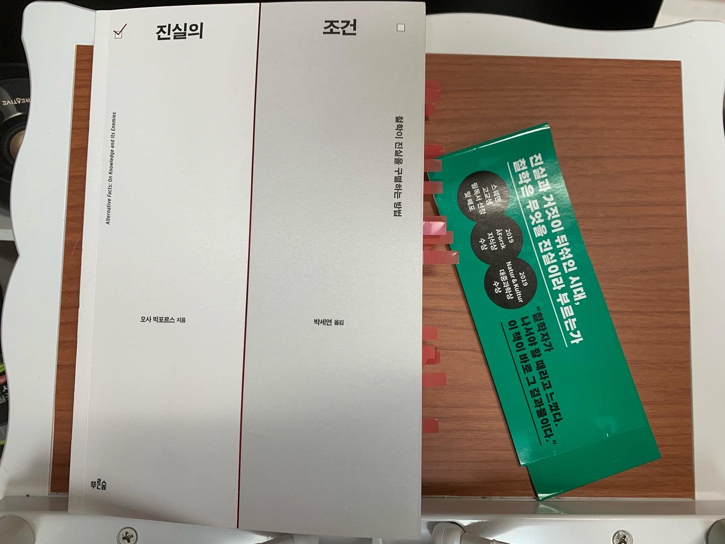 <진실의 조건>은 스웨덴 이론 철학 분야의 대가이자 스웨덴 한림원 평생 회원인 오사 빅포르스가 쓴 책으로, 진실과 거짓인 뒤섞인 시대에 대안적 사실이란 가능한가 물어보며 그게 왜 안되는지 철학적인 논증으로 비판하는 책이다.
