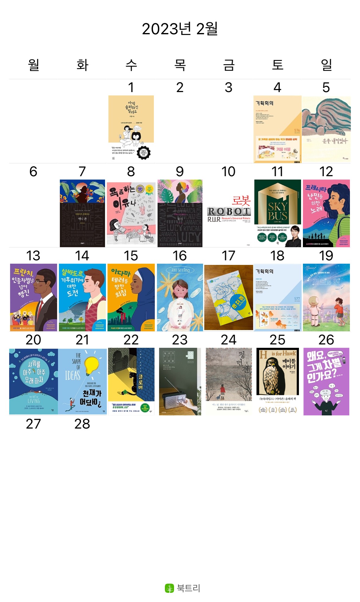 2023년 2월 (23권) 서평단 활동으로 청소년 책이 좀 많아 보이는데 거의 다 좋았다. 아이에게 좋은 책을 추천하고 싶어서 시작한 동화, 청소년 책 읽기는 나에게도 감동과 의미가 있어 감사하다.