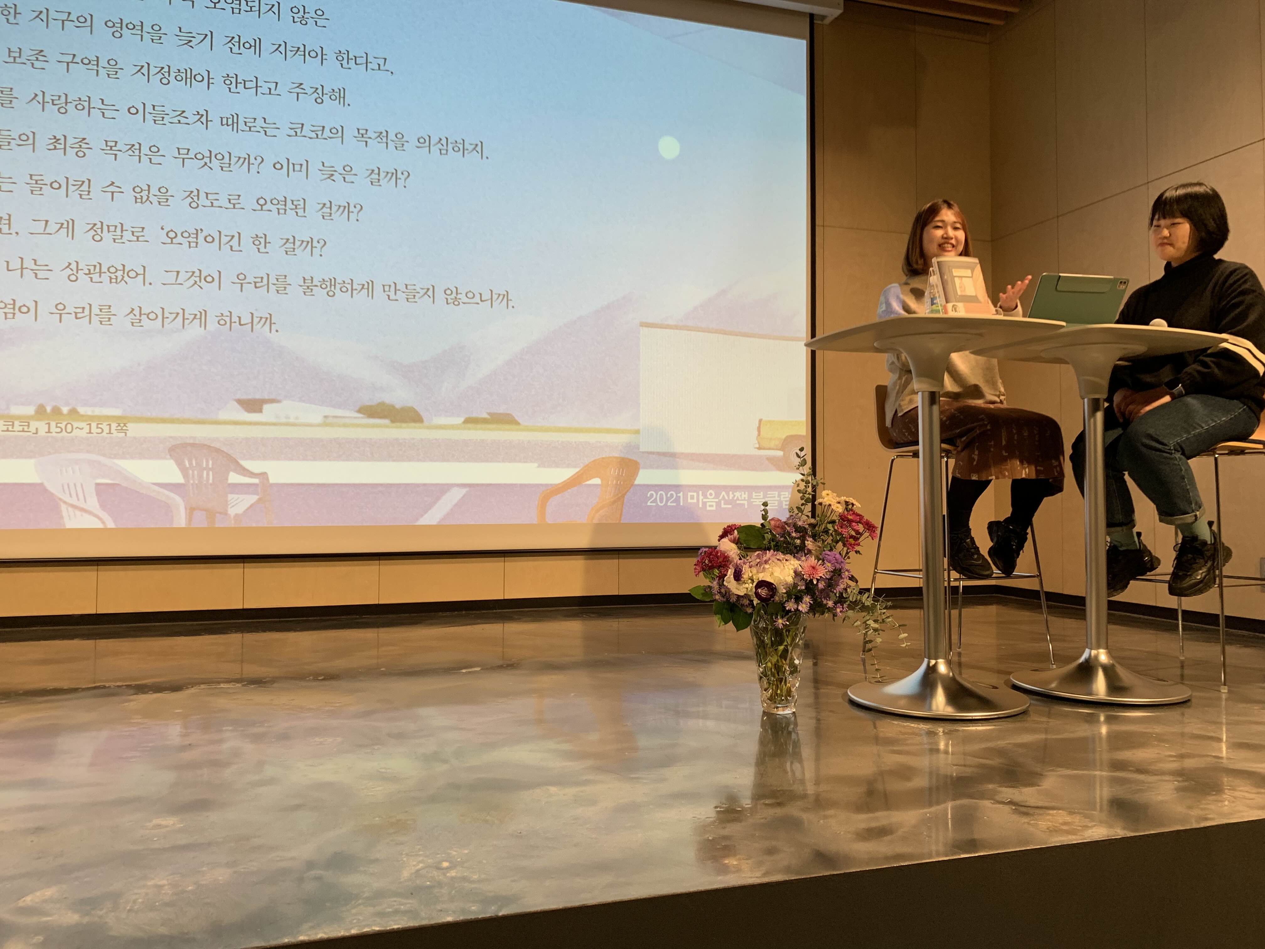 마음산책 북클럽 모임이 코로나 때문에 자주 열리지도 못했지만 그 동안 가려다 못 가기도 해서 나에겐 2년 전 이후 두번째 모임이었다. 새로 지은 마음산책 사옥 지하 홀에서 작가님 인사와 책 소개, 회원들 낭독 질의 응답이 한 시간 정도 진행됐다. 난 미리 낭독 신청도 못했는데, 못 오신 분 대신 읽겠다고 자진해서 읽었고. 얼굴은 뻘개졌지만 추억을 하나 만들었다. 원래 좋아하는 건 용감하게 한다. 오늘도 맨 앞자리에 앉아서 이야기를 들었다.